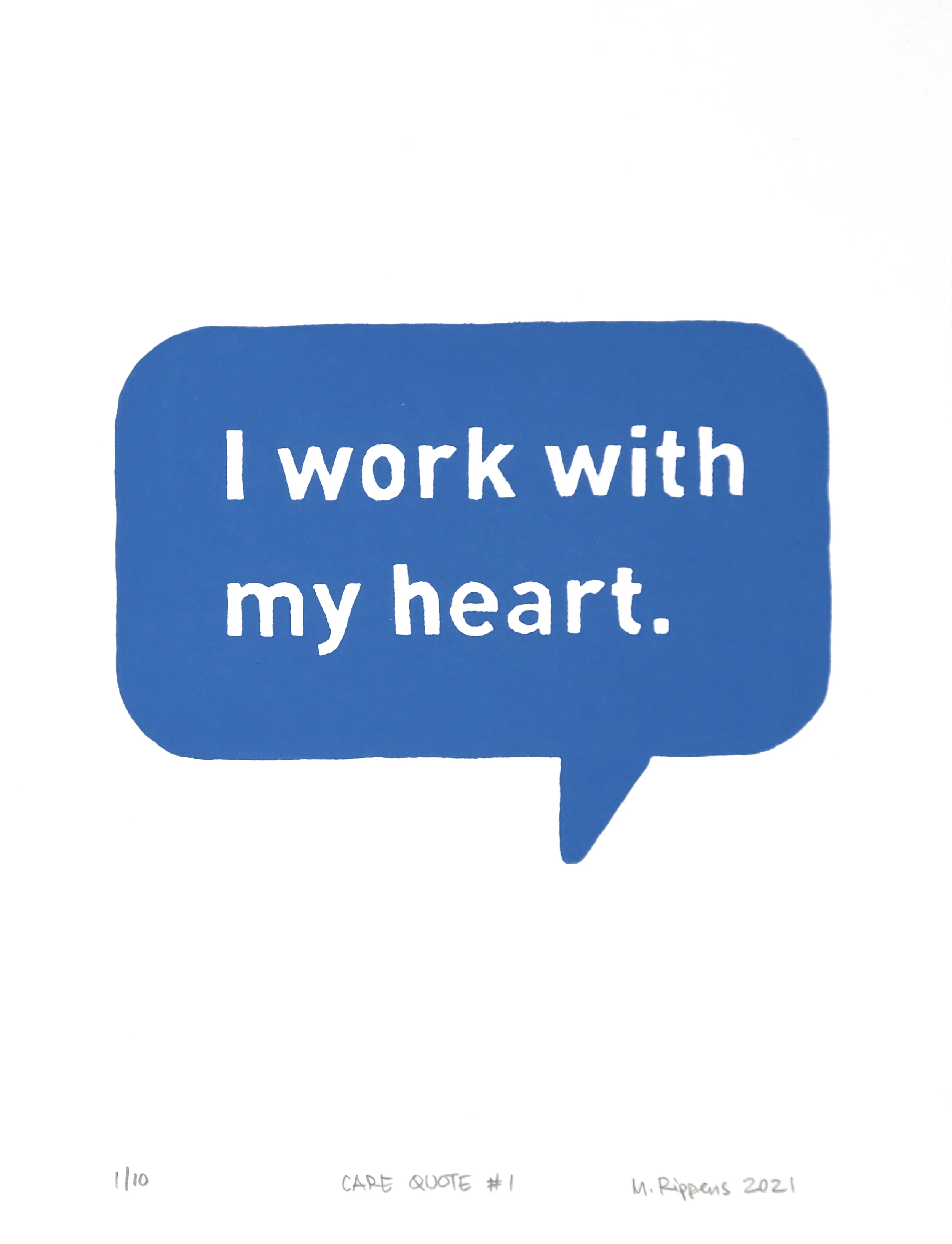 Care Quotes are hand-cut and printed by artist Michael Rippens. There are currently five designs in the series, with each pressing limited to an edition of ten. These prints are being offered to the public to raise awareness and funds for the Care Talk project and the Pilipino Workers Center of Southern California (PWC). A portion of the proceeds from each print sold will be donated to the PWC to sustain their advocacy and support for caregivers and other workers in the low-wage Filipino community. The remaining proceeds will help cover operating costs associated with the Care Talk project.